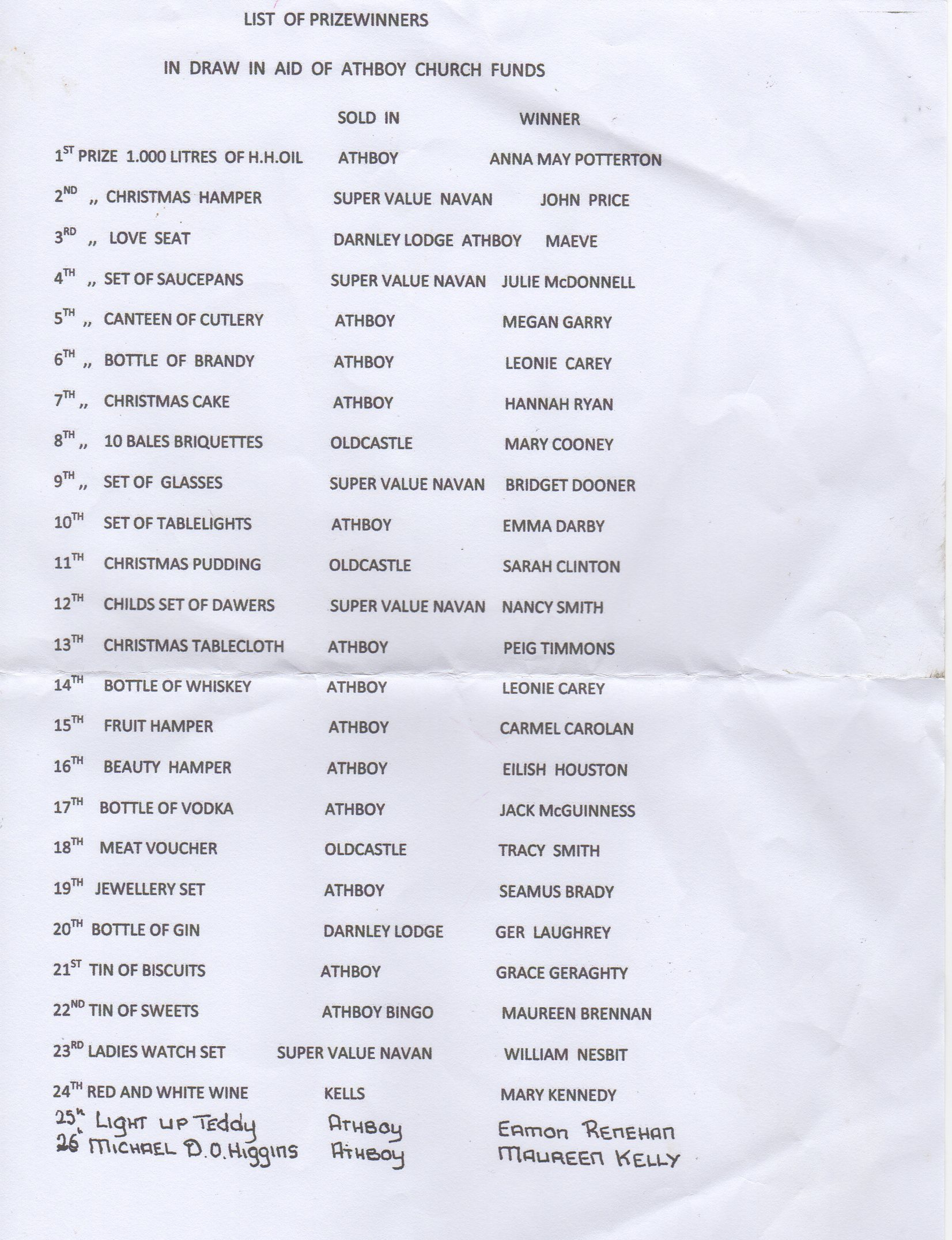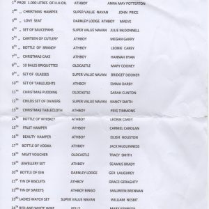 Christmas Raffle Winners Published on Check the list … you may have won a prize in our Annual Raffle held on Sunday 16th December in conjunction with our Bingo. Many thanks to the everybody who bought tickets, to those who sold tickets and all who sponsored prizes.