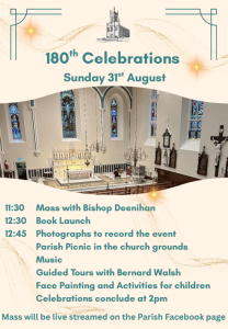 Next Sunday 31st August:11.30am Mass will be celebrated by Bishop Tom Deenihan and followed by a Parish Picnic in church grounds.